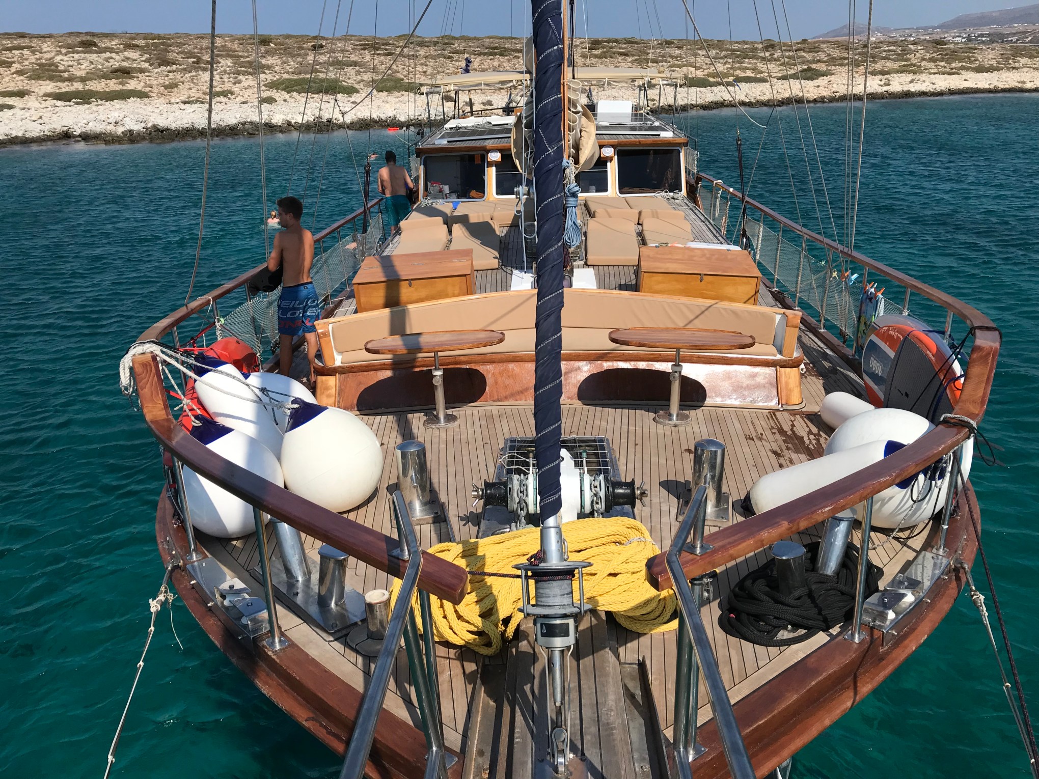 The Kosmas is an 88ft wooden Gulet, of Turkish origin, owned and operated by the indomitable Captain Alex of Greece-by-Sea. It was our home for seven days as we sailed amongst the Greek islands to celebrate our 30th wedding anniversary. It’s hard to imagine a sailing vessel, or a captain, with more character. Crashing through waves on windy crossings between islands, sheltering in the calm of a sandy bay, drinking ouzo and water, lively conversation over dinner, and retiring to our extremely cosy cabin below deck. It was, quite simply, exhilarating.