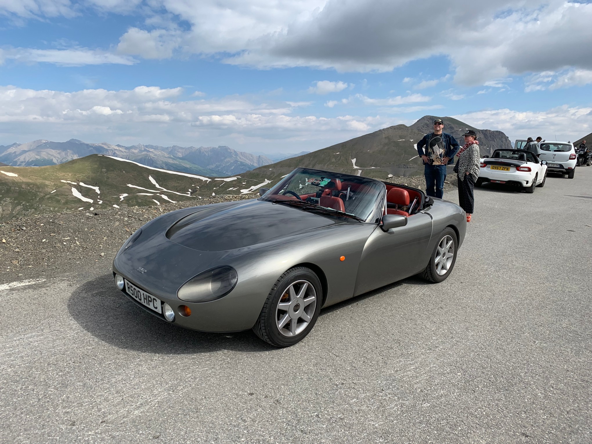This is by far my favourite car for driving in the Alps, the TVR Griffith 500, with the 5l Rover V8. It belongs to my friends Greg and Juliet, pictured here, and was our steed of choice for our annual motor-mountaineering trips to the French Alps. It is one of the most rewarding cars to drive well, rear-wheel drive with bags of oomph, no power-steering and no traction control. This photo-stop is at the top of the Col de la Bonette which, at 2,715m, is the highest paved road in the Alps and Europe’s highest through route (the signpost at the top is for Nice in the South of France). The car behind is my Fiat Abarth Spider, also a joy to drive on these roads but not in the same league as the mighty Griffith 500!